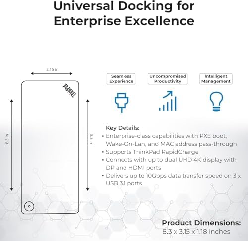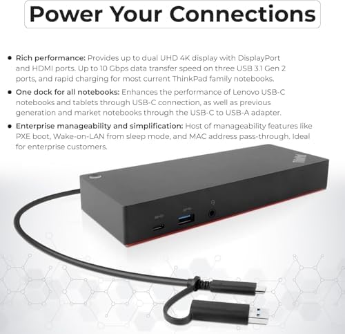Lenovo 40AF0135US Thinkpad Docking Station Dual Monitor Hybrid USB-C with USB-A - 1 Year Warranty, with 135W Adapter + HDMI Cable + DisplayPort Cable + USB-C Cable + Microfiber Cloth (Renewed)